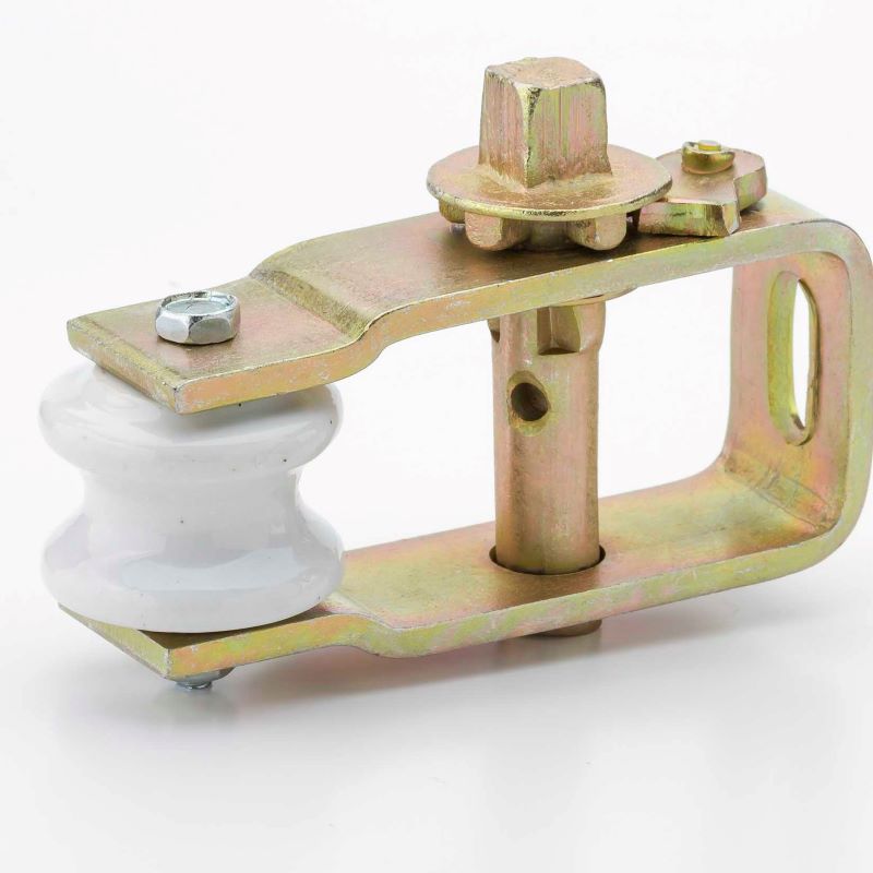 Super reforzado. Para tendidos de líneas madres con alambres de alta resistencia. Planchuela de Acero de 3/16¨- Perno de 16 mm Zincado electrolítico para gran duración a la intempérie. Aislador cerámico de gran masa central. Color DORADO