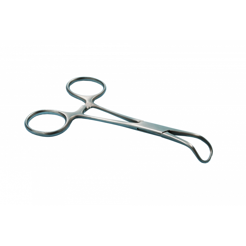 De extremos curvos y agudos, la pinza Backhaus se utiliza para fijar entre sí las compresas que delimitan el campo operatorio. Su tamaño varía de 6 a 14 cm.